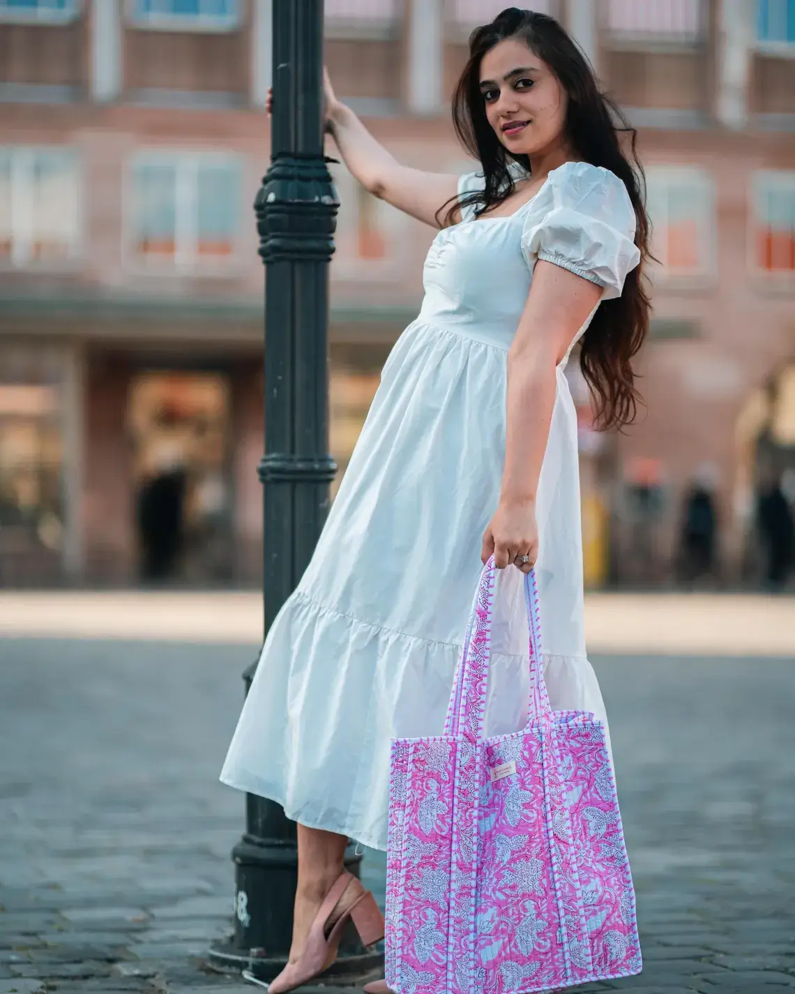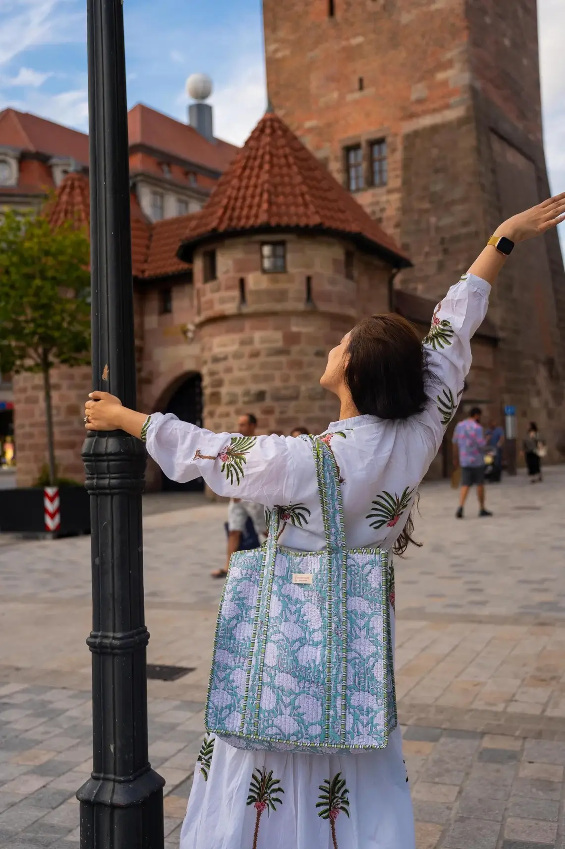 Lebendige Drucke, ausdrucksstarke Farben, hochwertiges Material – Die Tragetaschen von Haus of Namaste sind ein wahres Fashion-Statement! Das zeitlose Design passt perfekt zum modernen Look und macht die Mommy Bag zu einem stilvollen Accessoire. Dabei ist sie in verschiedenen Farben und Mustern erhältlich, sodass jede Frau die passende Mommy Bag für ihren individuellen Stil finden kann. Die Tragetaschen von Haus of Namaste werden von Hand gefertigt und liebevoll im Handblockdruckverfahren bedruckt. Jede Tasche ist ein Unikat und die Verarbeitung aus 100 % Premium-Baumwolle gewährleistet ein hohes Maß an Strapazierfähigkeit und Tragekomfort, während das geräumige Innere reichlich Platz für alle wichtigen Dinge bietet.